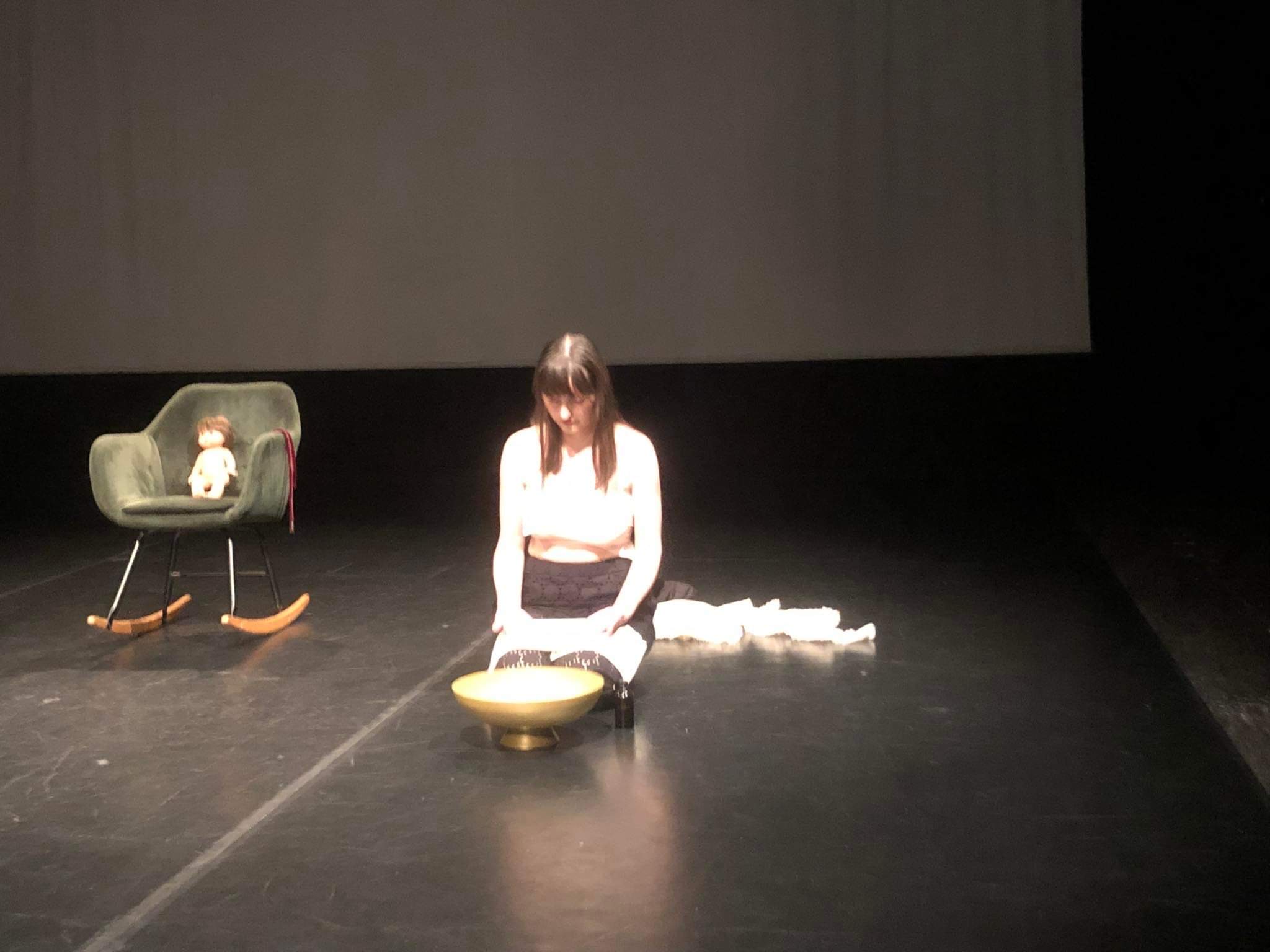 The performance incorporates elements such as traditional regional folk lullabies, dolls, water, red ribbons, hair, and myrrh oil. Myrrh symbolizes both death and life.